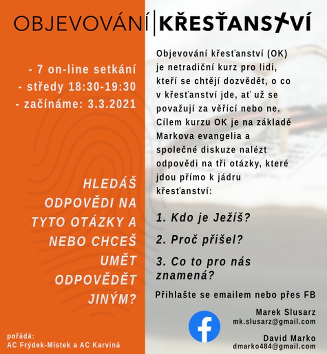 Netradiční kurz pro lidi, kteří se chtějí dozvědět, o co v křesťanství jde, ať se považují za věřící nebo ne.. Informace na FB